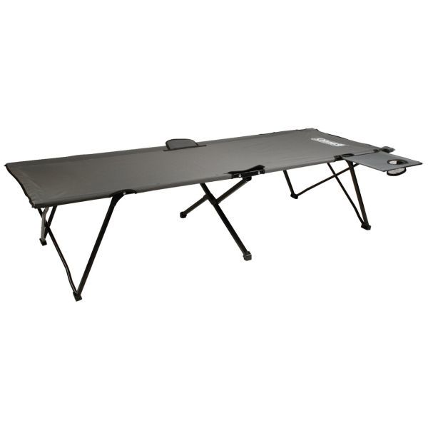 Kempingové ležadlo s praktickým príručným stolíkom a integrovaným držiakom nápojov v príručnom stolíku.