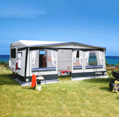 Predná stena pozostáva zo 4 častí, odnímateľná a dá sa zvinúť do verandy. Vďaka záclonám v zhode s dizajnom môžu byť predné dvere umiestnené buď na ľavej alebo na pravej strane.