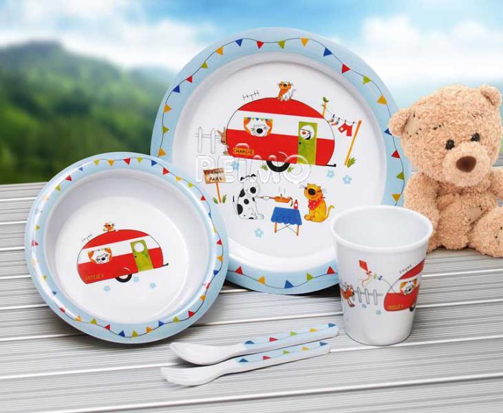 5-dielna sada detského riadu zo 100% melamínu s motívom karavanu.
