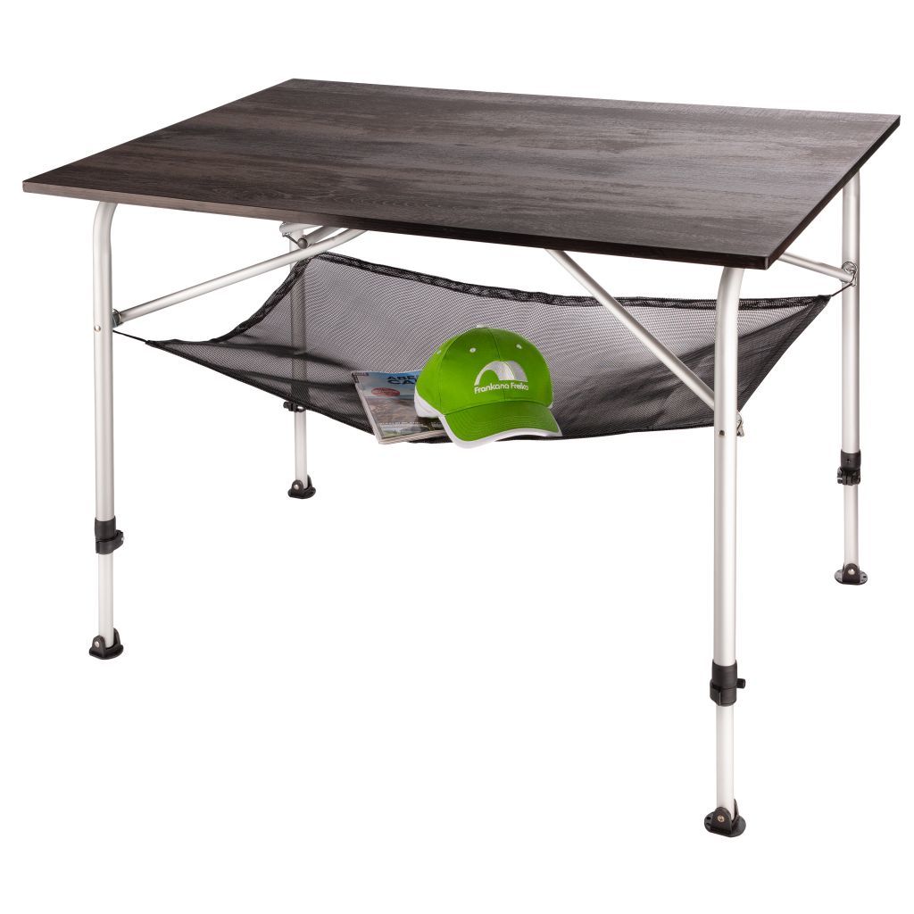 Klasický kempingový skladací stôl s robustnou doskou. Všetky štyri nohy sú plynule nastaviteľné od 59 do 72 cm. Stolová doska odolná voči poveternostným vplyvom, vč. úložná sieť a mleté kolíky.