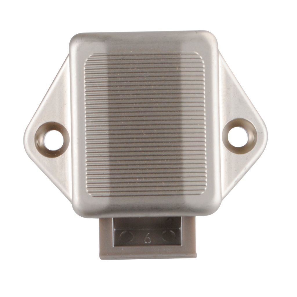Zámok pomocou tlačidla. Stlačením tlačidla zámok vyskočí dopredu a slúži ako kľučka dverí. 15 mm.