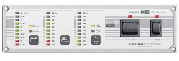 Panel ukazuje stav nabitia štartovacej alebo palubnej batérie, úroveň úžitkovej, odpadovej alebo fekálnej nádrže. Integrovaný hlavný vypínač (16 A) a spínač čerpadla (10 A).