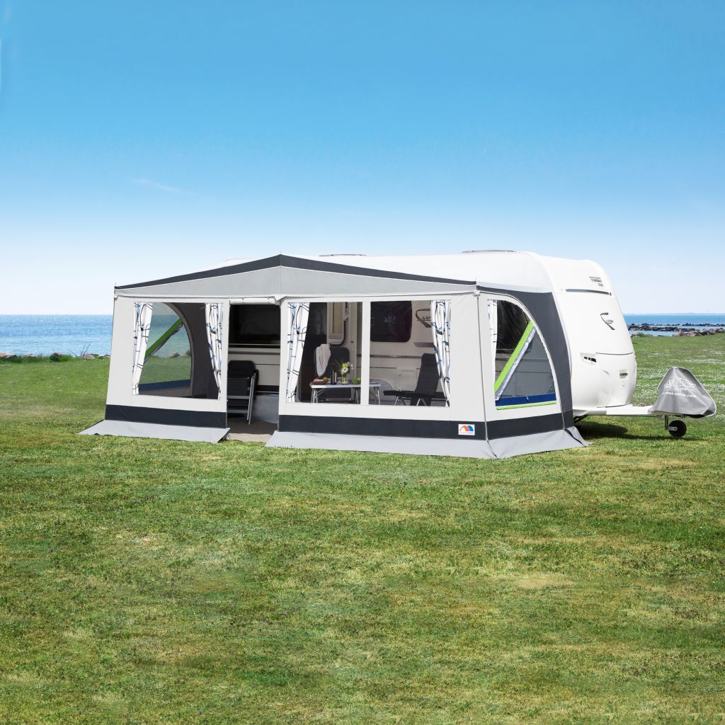 Táto predná stena sa skladá z dvoch častí a je pripevnená pomocou zipsov na strechu a bočné steny. Toto rozšírenie je vhodné iba so základnými tyčami. Záclony nie sú súčasťou balenia.