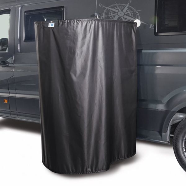 Skladací vonkajší sprchovací kút flexiMAGS v elegantnej čiernej farbe je navrhnutý tak, aby sa dal jednoducho uchytiť na bočnú stenu dodávky, karavanu či obytného auta. Vďaka šikovnému magnetickému systému sa záves pripevní pevne a bez rizika poškriabania laku. Magnetický je aj držiak sprchovej hlavice, takže si ho môžete umiestniť presne tam, kde vám najviac vyhovuje. Po rozložení vytvorí priestranný priestor na pohodlné a diskrétne sprchovanie, pričom po zložení nezaberie takmer žiadne miesto.
