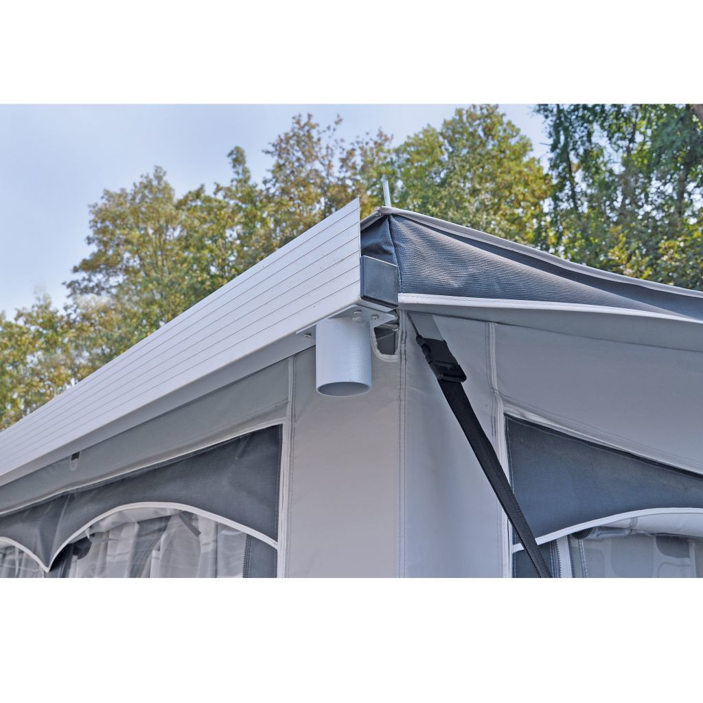 Kvalitný hliníkový odkvapový žľab je namontovaný na stĺpy markízy a zaisťuje kontrolované odtok dažďovej vody zo strechy.