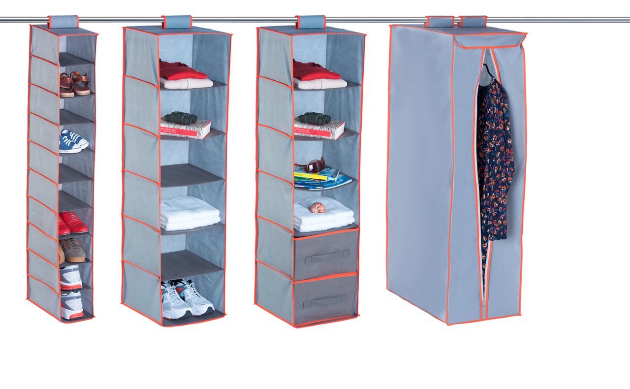 S 10 priehradkami a vystuženými policami na oddelenie tričiek, topánok atď. Rozmery ca. Š 17 x H 120 x D 32 cm.